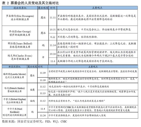 这次获得投票权的四位委员分别为明尼阿波利斯联储主席卡什卡里(Neel Kashkari)、克利兰夫联储主席梅斯特(Loretta Mester)、费城联储主席哈克(Patrick Harker)、达拉斯联储主席卡普兰(Robert Kaplan)。梅斯特对三次降息均持反对态度,哈克赞成第一次降息,但反对后两次,相对鹰派程度弱。卡普兰支持2019年降息,但10月赞成降息时强调除非形势恶化,否则不大可能进一步降息。卡什卡利则希望2019年降息幅度要比他的同事们更大且美联储应承诺在通胀率稳定达到2%的水平之前不升息。