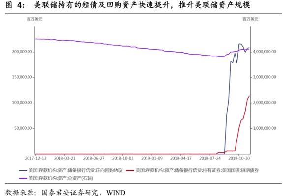 今年9月以来美国回购市场出现利率飘升,市场融资趋紧,导致美联储不得不不断加大回购规模,同时开启了短期国债的购买。