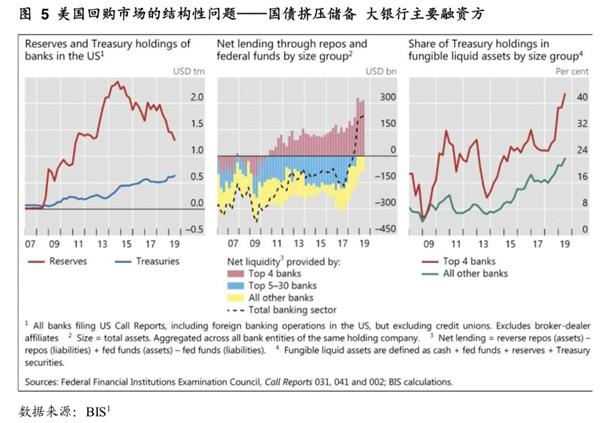 对于回购市场出现的紧张局面,纽约联储的行长约翰威廉姆斯在演讲中给出解释,认为主要是解释为年末的缴税因素以及大量美国国债的发行所致。但是近期BIS在其季度回顾中对美国回购市场持续紧张局面给出了结构性的解释。08年金融危机后,银行的资产结构发生变化,国债持有量上升而现金储备则下降;另外,整体的回购市场以大型银行为主,美国前4大银行在6月底的净融出规模已经达到了3000亿美元,是主要的融出方。但是随着美联储此前的缩表进程,导致大型银行大国债头寸缺少了稳定的买家,银行需要调节其流动资产的结构。因此,美国回购市场的紧张也是美联储长期资产购买的滞后效应的体现。