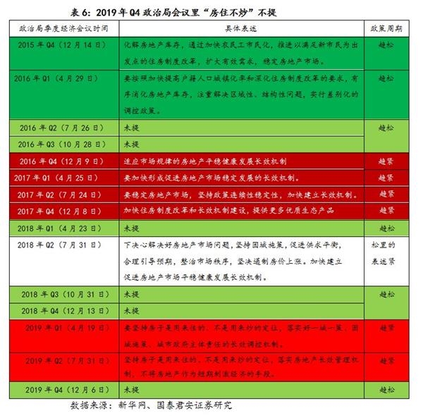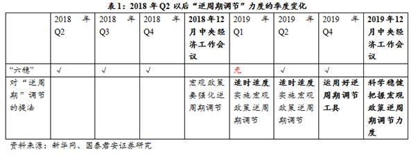 (2)2019年逆周期调控呈现“一季度松—二季度紧—三季度再略松—四季度保持”的节奏。2019年Q1政治局会议后,“逆周期”调节收油。在2019年一季度政策出现明显放松后,2019年Q1政治局里“六稳”消失。2019年Q3-Q4再度“轻踩油门”。