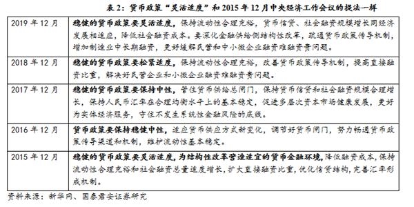 此次对2020年货币政策的定调是“灵活适度”,这个和2015年12月中央经济工作会议的提法一样(表2)。在2014年二季度-2017年上半年的货币政策周期中,2015年货币政策宽松见顶,表现为降准4次,2016年3月再次降准后就不动了。直至进入此轮货币政策宽松周期(2018年降准3次、2019年3次)。