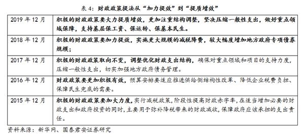 2、“逆周期”政策大方向、基调、力度还是延续2019年下半年,但节奏仍将稳健,而且更加重视组合拳,结构性。中央经济工作会议提出“必须科学稳健把握宏观政策逆周期调节力度”。对逆周期调控力度的表述与2019年Q4政治局会议相仿。2019年Q4政治局会议“用好逆周期政策工具”的提法是11月的总理座谈会上提出的。2018年12月中央经济工作会议的提法是“宏观政策要强化逆周期调节,实施预调微调,稳定总需求”。
