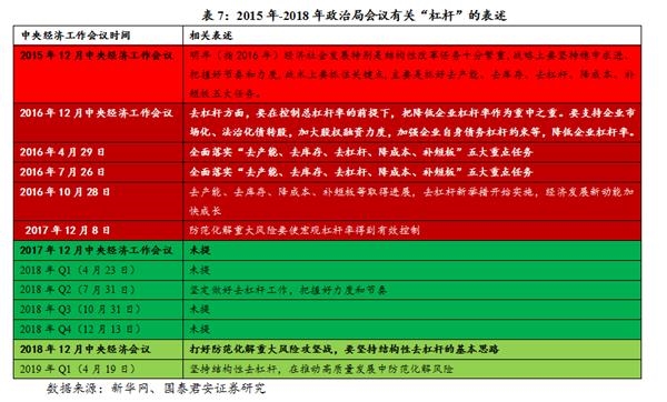 “去杠杆”一词,在2015年(两次)、2016年(一次)、2018年(一次)12月的中央经济工作会议中都出现过。但是,并没有出现在2019年12月的中央经济工作会议中。2019年Q1和Q2政治局会议均强调“金融供给侧结构性改革”。2018年12月的中央经济工作会议、2019年Q1政治局会议都强调“坚持结构性去杠杆”;2019年Q2政治局会议提出“加快”僵尸企业“出清”。这主要是对金融体系的判断更加乐观—我国金融体系总体健康,具备化解各类风险的能力。
