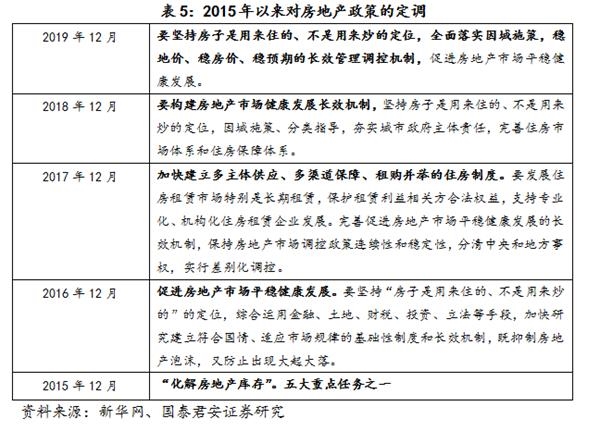 2、从房地产调控政策力度上来看,要比2018年紧一些,比2019年松一些。2017年12月的中央经济工作会议并没有提“房住不炒”。2018年四个季度出现了松动。2018年12月和2019年12月都提“房住不炒”,但今年边际上增加了“三稳”—稳地价、稳房价、稳预期。此外,“房住不炒”并没有出现在2019年Q4的政治局会议里。