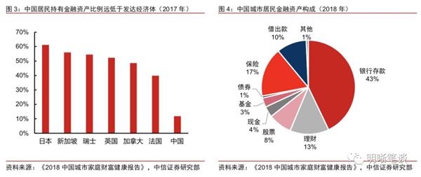 与重仓房地产相对应,中国居民持有金融资产的比例明显偏低。根据广发银行与西南财大共同推出的《2018中国城市家庭财富健康报告》,中国城镇居民持有金融资产的比例仅有11.8%,远低于大部分发达国家水平。另外,从金融资产的结构来看,银行存款的比例略高——在有数据可查的35个OECD国家中,仅有8个国家的存款和现金占家庭金融资产比例超过了50%。