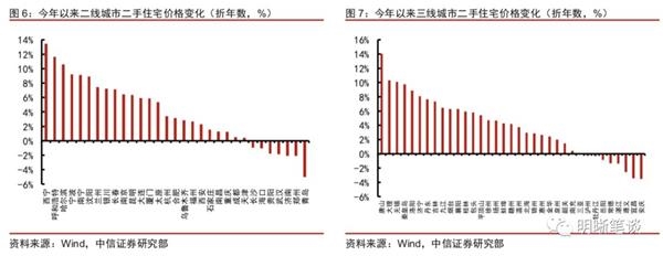 二三线城市房价分化加剧,不少城市房价已经开始下跌。二线城市方面,尽管部分城市房价上涨仍在10%以上,但青岛、郑州、济南、武汉等部分城市二手房价格已经开启了下跌模式。三线城市也面临类似局面,大理、唐山、洛阳等不少城市房价涨速仍然不减,但以岳阳、泸州为代表的不少城市房价已经出现下跌情形,整体房价上涨速度已经趋缓。总体来看,无论是新建住宅还是二手房,无论是二线城市还是三线城市,今年的表现都不及过去三年。