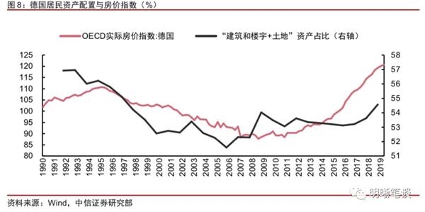 房产在德国居民资产中的占比与房价较为相关。在德国统计局公布的居民部门资产负债表中,“建筑和楼宇”与“建筑和楼宇土地”代表居民在房产方面的投资,两项之和的占比大致与实际房价的变化趋势一致:在房价下降时,居民减少了房产的配置,而在房价上涨时,居民对房产的配置比例又有所增加。