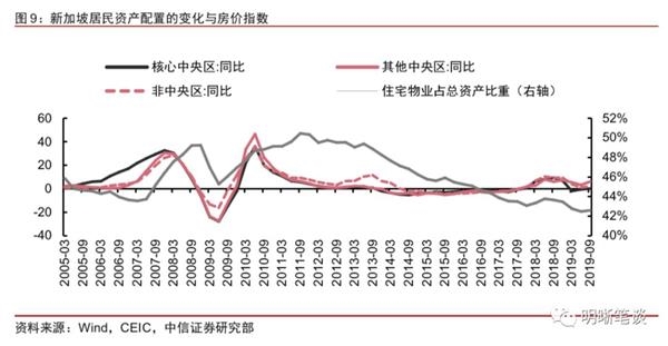 新加坡居民房产持仓的持续下降或源于金融资产的增加。新加坡住房的自有率非常高,这就意味着居民增配房产的动力不强,即便是以旧换新的置换需求,在房价常年变化不大的情况下,居民持有的房产增速也相对缓慢。然而,相比于投资房地产,投资于金融资产却能够不断给居民带来正收益,金融资产的不断膨胀将会稀释房产在居民资产结构中的比例,导致房产占比大致以每年1%的速度下降。